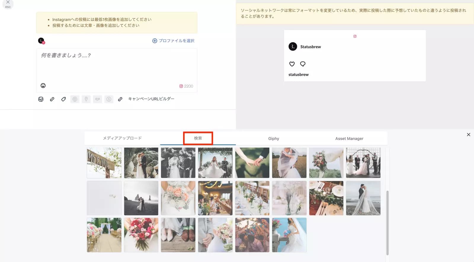 もしくはStatusbrewの著作権フリーのメディアクラウドUnsplashとPixabayの統合を使用して、こういうイメージが合うと思ったもので投稿の下書きを作成し、最終的に投稿に使用することができるダイナミックなムードボードを作成することができます。