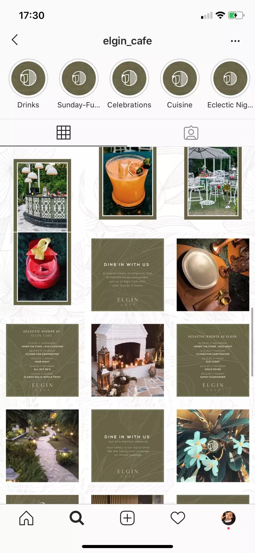 良い例があります。 こちらはカフェダイニングバーのアカウントですが、これこそデザインの統一感といっても良いでしょう。 フォントとブランドカラー(オリーブグリーンとモスグリーンの中間)はもちろんのこと、写真に背景を使う場合もCanvaからデザインテンプレートを利用しています。