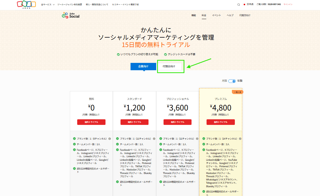 Zoho socialの利点はその手頃さです。注意点としては、上記の料金は企業向けプランであり、代理店向けには別プランが用意されていることです。企業向けには無料プランも提供されていますが、一番人気はプレミアムプランとのことなので、年間で考えると相応の支出にはなりそうです。