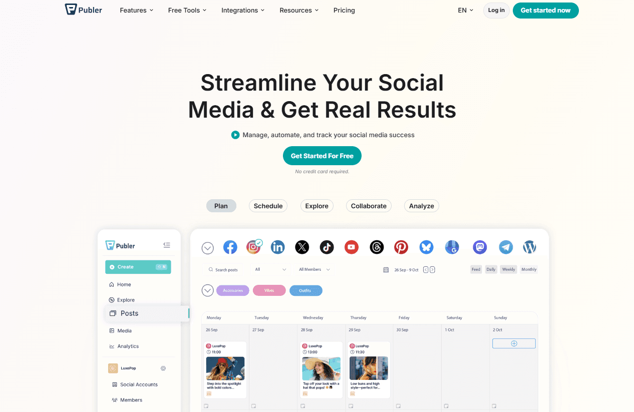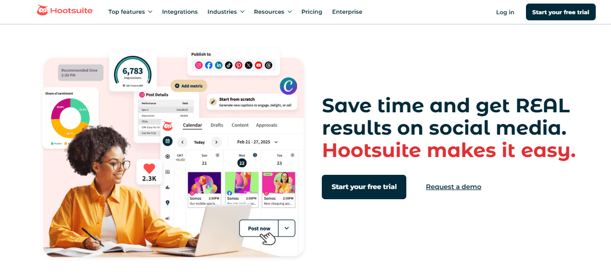 ソーシャルメディア管理(SMM)機能に強みを持つ老舗ツール。投稿の作成、スケジューリング、エンゲージメント管理、ソーシャルメディアマーケティングのための統合プラットフォーム。