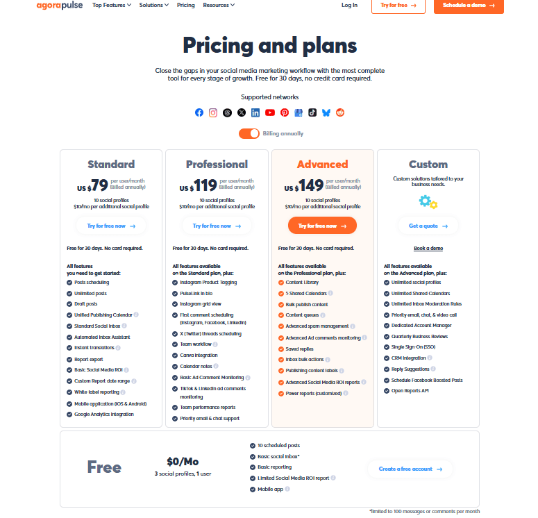 4つのプランがあり一番人気は$149/月のAdvancedプランのようですが、承認ワークフローを利用できるのはCustomプランのみです。とはいえ、Hootsuite等と比べると、手頃に利用できます。また、機能は限られますが無料プランもあります。