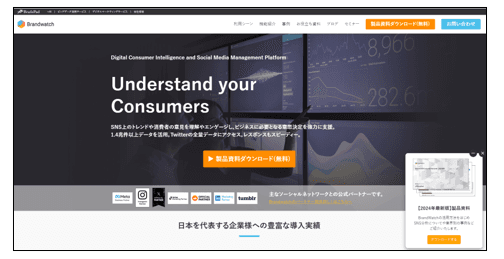 先ほど触れた通り、Brandwatchは英国生まれのツールですが、日本では代理店を通して販売されています。 それぞれWEBサイトが異なるため、日本語と英語どちらのサイトにアクセスするかによって、このツールの印象はやや異なります。 日本向けの代理店によるサイトを確認すると、下記の3つの機能が柱となっているようです。