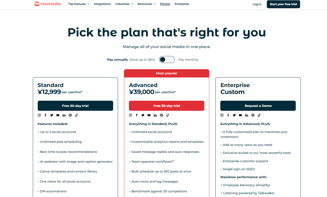 Hootsuiteの料金は3プランです。企業によっては、必要な機能を求めるとEnterpriseプランにする必要があるかもしれません。プラン内容は細かくチェックしましょう。