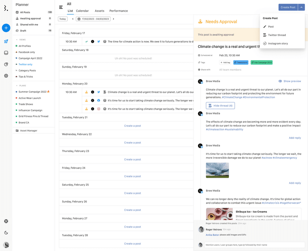 投稿機能:複数アカウントの一元管理、予約投稿、大量投稿の一括作成・予約、承認ワークフロー(外部ユーザーの参加も可)、OpenAIとの連携によるキャプション生成、ブランドトーンやイメージを設定するブランドキット機能、自動タグ付け