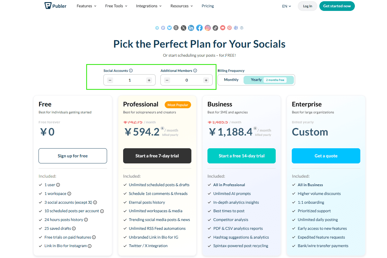 Publerには無料プランと3つの有料プランが用意されています。追加したいSNSアカウント数、ユーザー数を入力することで料金が自動計算されるので、簡単に料金を確認することができます。