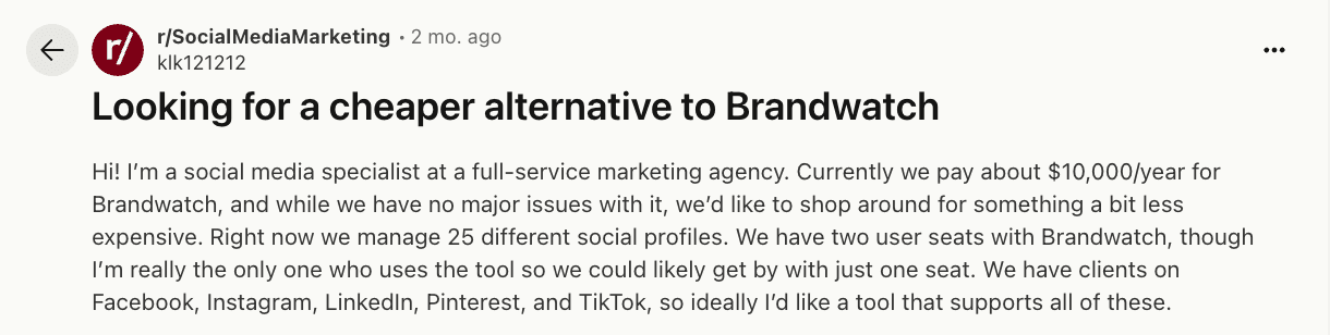 こちらのRedditでBrandwatchに対するスレッドを立てているユーザーですが、年間1万ドル(日本円 150万)を払っているようです。年間1万ドルというからには、よほどの大人数で使っている、もしくは多くのソーシャルアカウントを運用しているのでは?思うはずです。