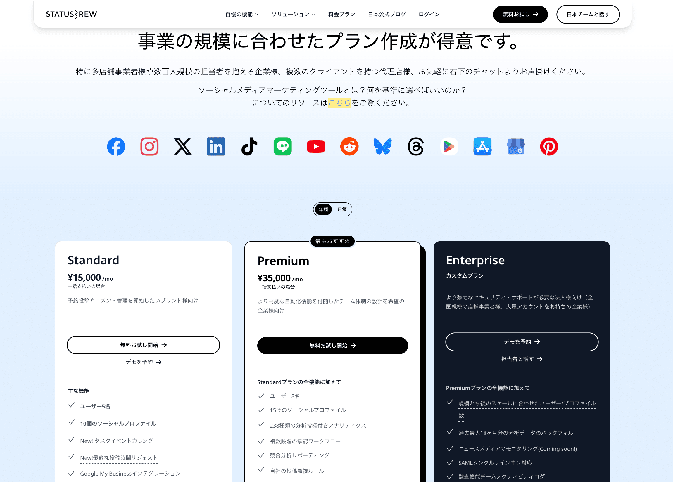 Statusbrewは、10個のソーシャルプロファイルと5名のユーザーの追加から開始できる¥15,000のStandardプランがおすすめです。この範囲でアカウント数が足りるのであれば、ワークスペースごとにクライアントを分ける「部屋」機能は無制限で作成できるため、「クライアントごと」のチャージが一切ありません。