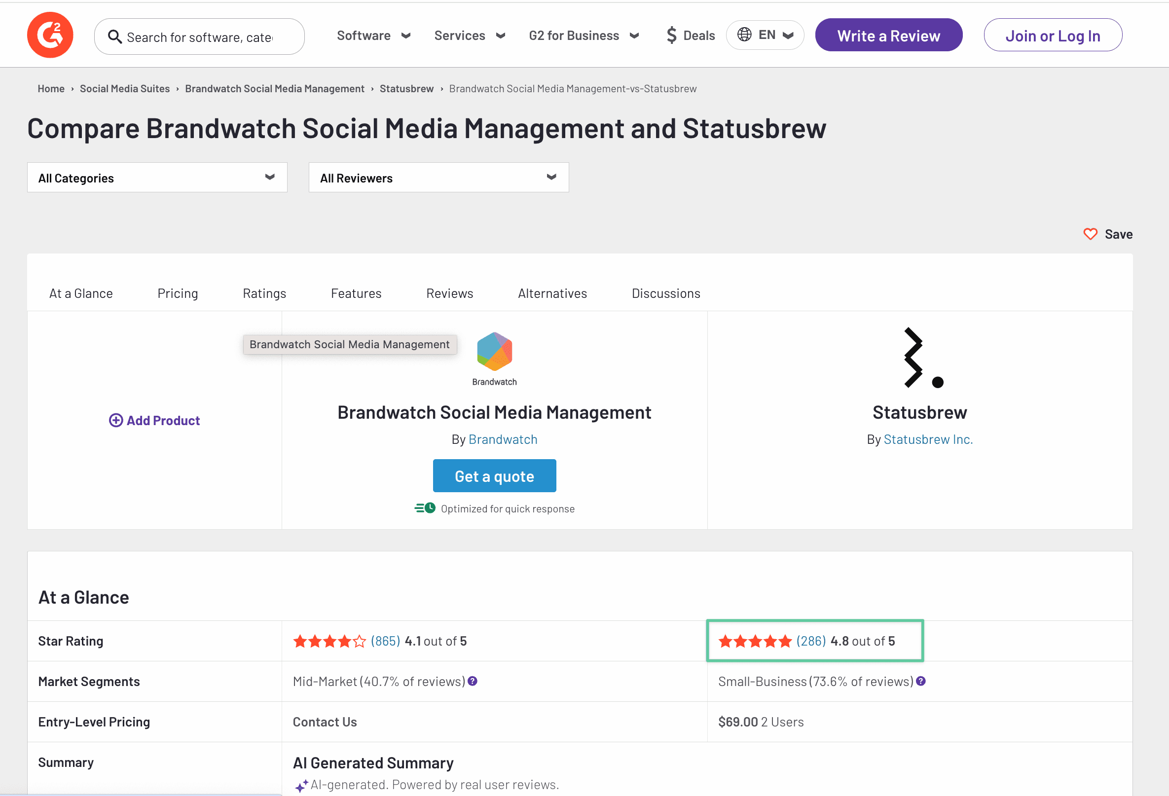 StatusbrewとBrandwatch 世界のソフトウェアレビューサイトの評価で比較
