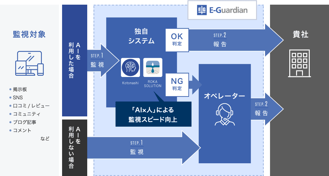 株式会社E-Guardianの投稿監視サービス(有人監視)のワークフローの図引用: E-Guardian