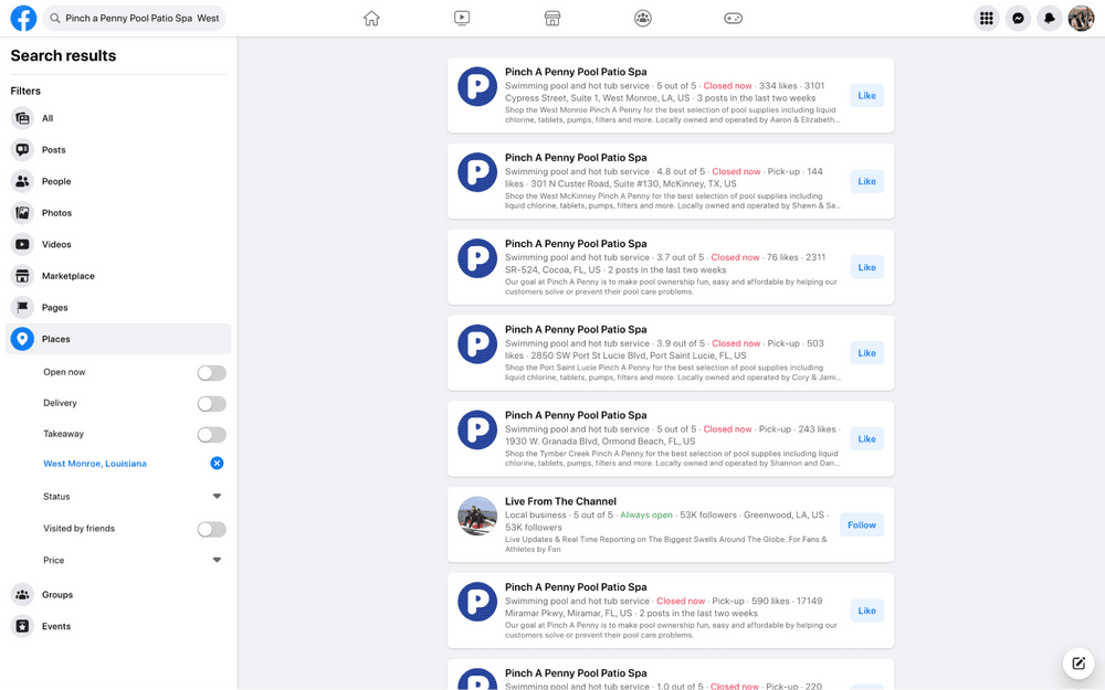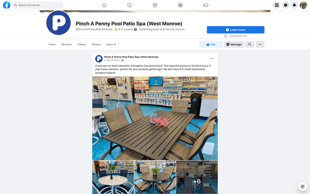 以下の図はアメリカで最も大規模なフランチャイズで運営する家庭用プール整備会社Pinch a Penny Pool Patio SpaのFacebookページになっています。各地域でそれぞれFacebookページを作成していることがわかります。また、2枚目の図は、West Monroe店のFacebookページの投稿です。West Monroe店へプールサイドの家具が新しく出荷されたことを知らせる例です。