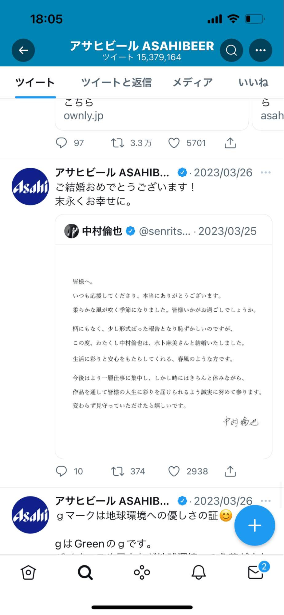 以下の画像で一例を示すと、先日、水ト麻美さんと中村倫也さんが結婚を発表し、世間で話題になりました。フォロワー数100万人を超える、アサヒビールさんのTwitterもビールの投稿だけでなく、このように、CMキャラクターを努める中村倫也さんの入籍を公式Twitterからお祝いしています。このように、事業とは直接関係のないことでも、柔軟に話題に入ることにより、双方間のコミュニケーションを感じられやすくなり、親しみを持ちやすいと感じられ、消費者に受け入れられやすくなります。