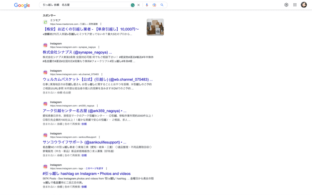 「Instagramなどの投稿に、特定のキーワードを含めることで、GoogleやYahooなどの検索エンジンもウェブサイトと同様にソーシャル投稿もSEOを高める作用があります。例えばユーザーが近場で出来るだけ格安の引越し業者を探したい場合」のクエリを埋め込むことで、このようにInstagramのアカウントや投稿が直で検索結果に表示されます。
