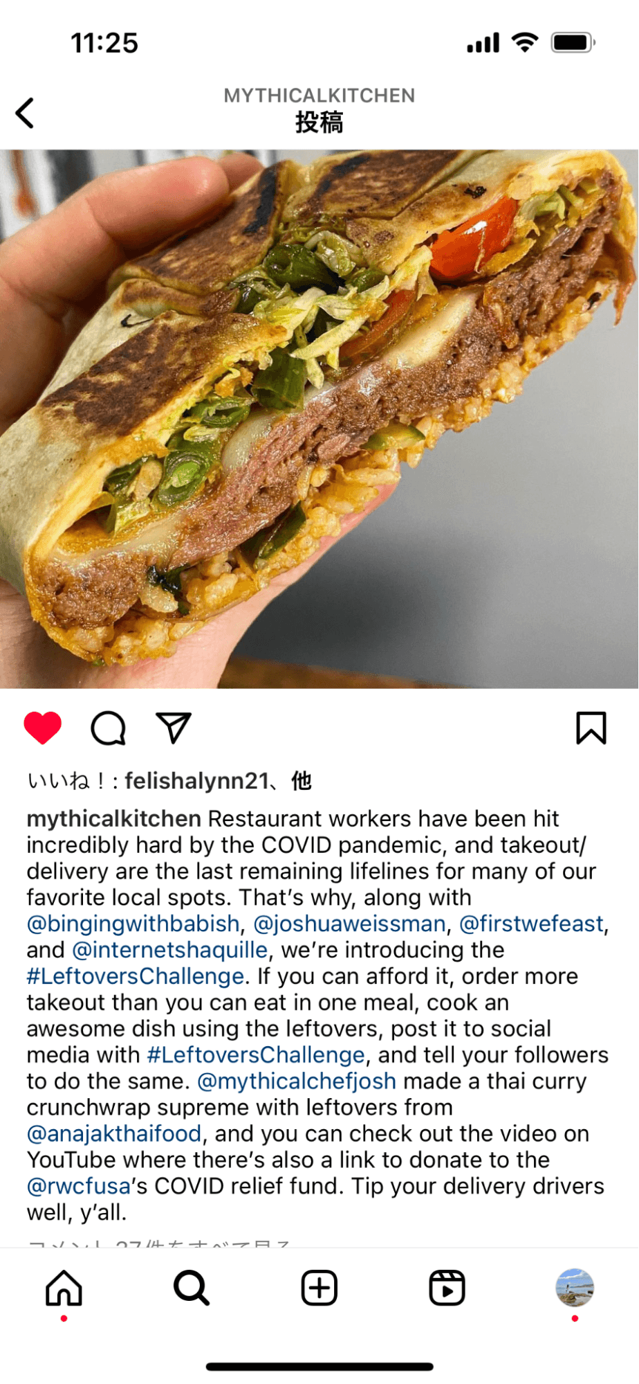 2020年新型コロナウイルスが蔓延した時期に、食のインフルエンサーMythical Kitchenは、パンデミックにより影響を受けた離職中の飲食店従業員を支援するために、#LeftoversChallengeという企画を考えました。この挑戦は、人々が自分で食べきれないほどのテイクアウトを注文し、その残り物で何か新しいものを作るというムーブを巻き起こしました。また、このチャレンジは、新型コロナウイルスによりステイホームを余儀なくされたあの期間の間、なんとか地元のレストランを存続させるために多くの人々を巻き込み企業の存続に貢献しました。