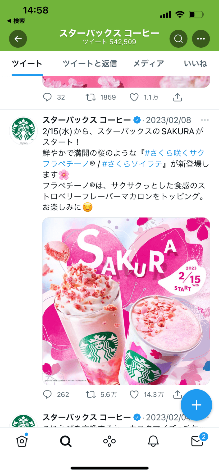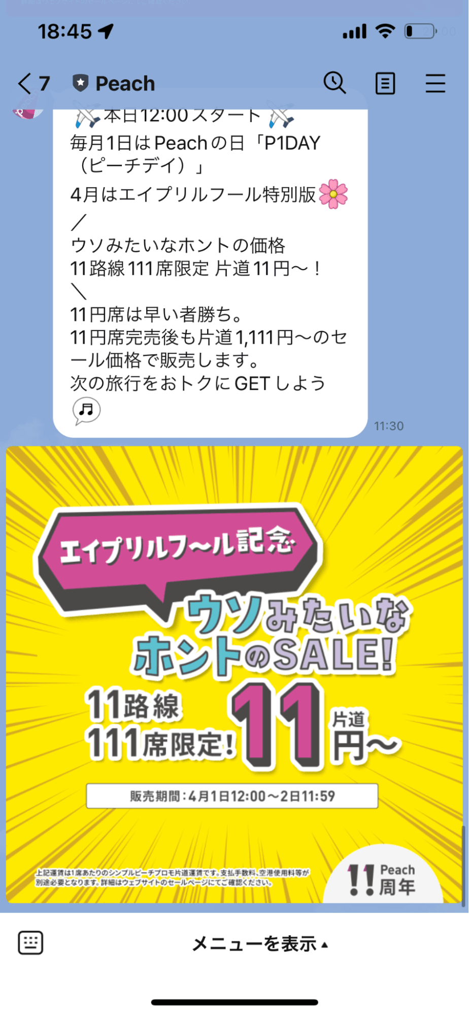 航空会社のPeachは公式LINEやTwitterページで定期的にお得な情報を投稿しています。この投稿では、11路線、111席限定で片道11円からというキャンペーンを打ち出しました。実際に、このようなキャンペーンを定期的に行うことにより、消費者は旅行や旅に行く気持ちが高まったり、競争率の高いキャンペーンの航空券はゲットできずともPeachの航空券を購入するきっかけになります。