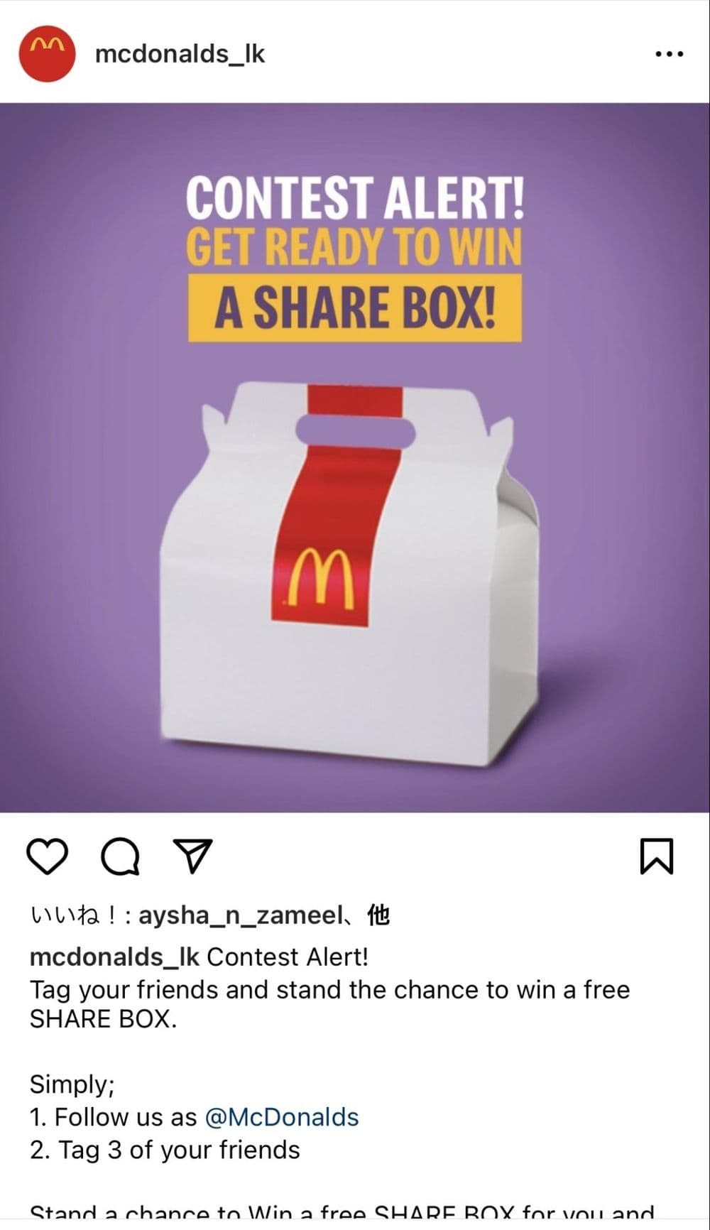 上記の写真はスリランカのマクドナルドの一例となっています。このコンテストは、フォロワーが投稿に「いいね!」を押して、3人の友人をタグ付けする必要があるため、この店舗のソーシャルメディアの存在感を高めるのに役立っています。コンテストに参加する人が増えれば、広告を見てこのマクドナルドの店舗を知る人の数が3倍になる可能性があると言えます。