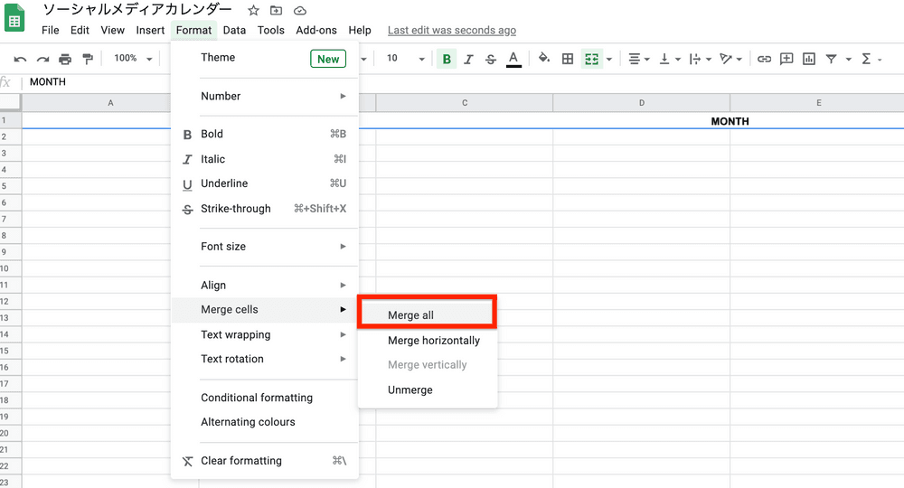 次に、最初の行のセルを強調表示して、[フォーマット]> [セルの結合]> [すべての結合]を選択します。 テンプレートのプレースホルダーとして「Month」を入力します。 フォントスタイルをお好みでカスタマイズし、テキストを中央に配置します。