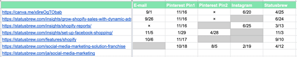またもGoogleスプレッドシートを使用して、各ソーシャルメディアチャネルでコンテンツをいつどこで共有したかを追跡します。 追跡シートは、チームとのコンテンツプロモーションの微調整にも役立ちます。 メモを使用して、各投稿のツイートテキストと説明を追加しましょう。