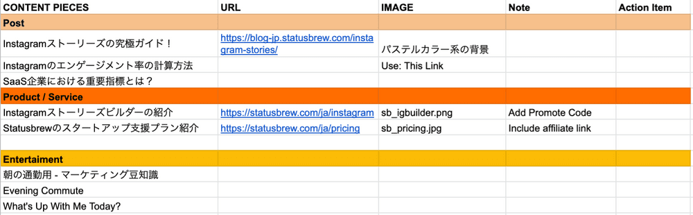 投稿の公開日、投稿のコンセプト説明、URL、画像、アクションアイテム(プロモコードなど)、キャンペーン、およびワークフローに必要なその他の詳細を書き込みましょう。毎週または毎月のコンテンツテーマがある場合は、スプレッドシートの左側に列を追加して、テーマを含めます。