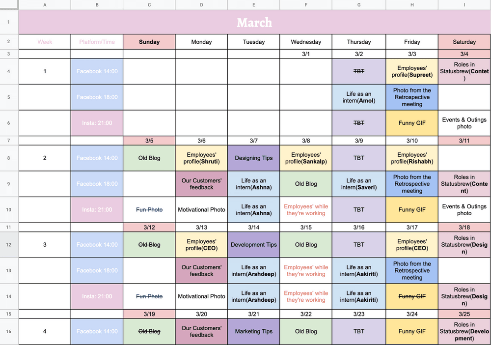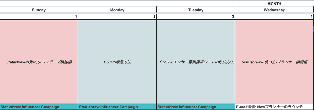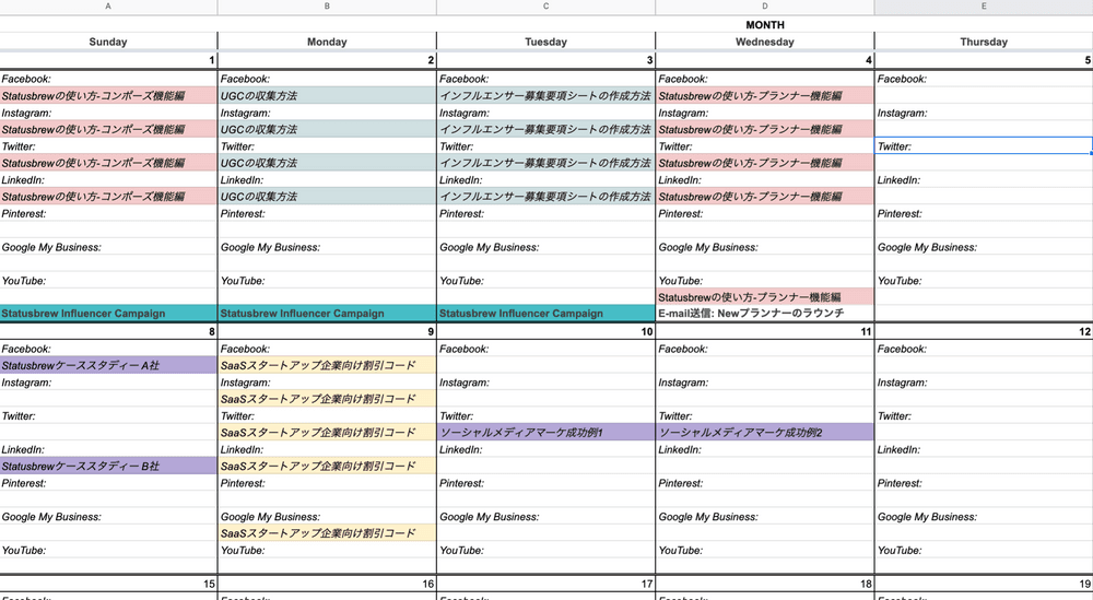 フォーマットはあなた次第です。 こちらはみなさんが普通に想像する月間カレンダーですが、より組織として、つまりチームとして戦略立ててコンテンツプランニングするにはもっと多くの詳細を組み込むべきでしょう。そちらはStatusbrewの別のエディトリアルカレンダーについてのブログでご紹介していますのでご参照ください。