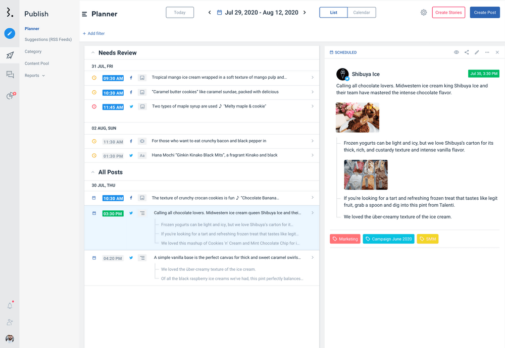 Statusbrewなどのツールを使用してユーザー生成コンテンツ、RSSフィードを管理し、さらに投稿までに準備と調整が必要なオリジナルコンテンツ、画像、タイムリーなプロモーションを計画することをお勧めします。 投稿予約ツールの各カテゴリに同じカラーコードを使用するとパッとみてわかりますね。