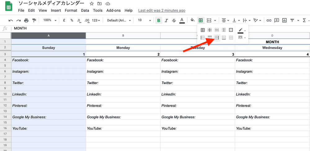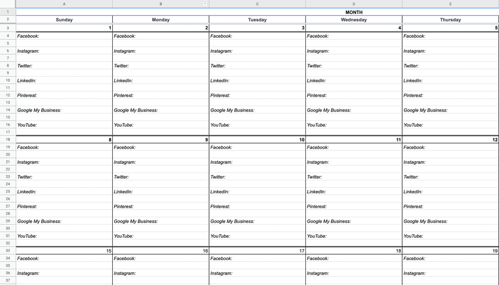次に、ソーシャルメディアチャネルを各日付に追加します。 投稿の頻度に合わせて、各プロファイルの間に1行または2行を予備として残します。 次に、各列を選択して、右の罫線を追加します。