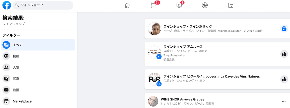 少なくとも、ご自身の業界の競合他社はどこか、パッと出てくる企業名や店舗名があるかと思います。 あなたの業界のニッチに関連するキーワードを各チャンネルで検索しましょう。 たとえば、「ワイン」を販売している場合、Facebookでワインショップと検索すると、ワインの小売店のリストが表示されます。このリストからまず知らなかった競合を把握しましょう。