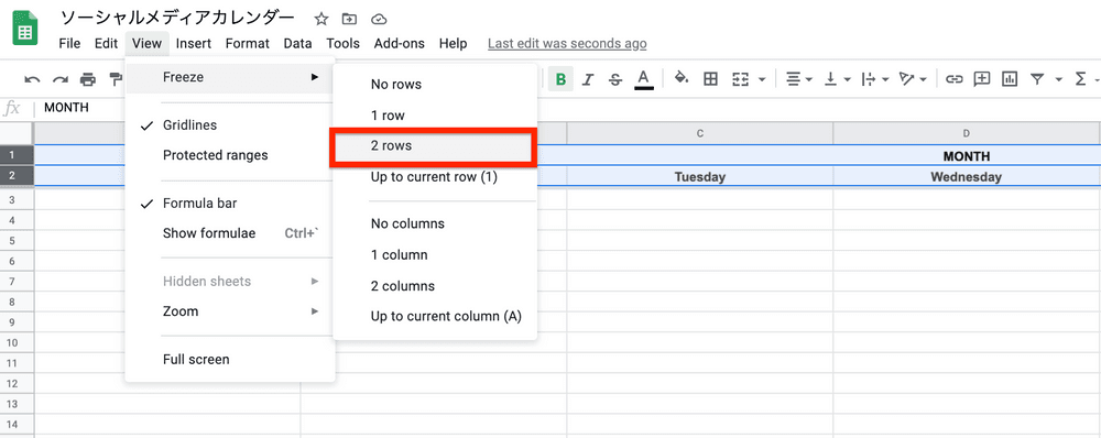2行目に、日曜日から始まる曜日を入力します。 必要に応じて、これら2つの行(月と曜日)を固定させて、常に表示されたままにすることができます。 2つの行を強調表示し、[表示]> [固定]> [2行]を選択します。