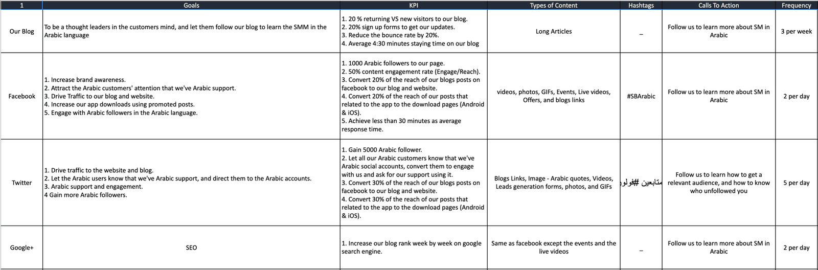 こちらは私たちStatusbrewの実際のエディトリアルカレンダーの中の1シート目、目標設定の一部です。 例えばFacebookの目標は ・ブランド認知度を高める ・アラビア語圏ユーザーのカスタマーサポート対応を謳って惹きつける ・ブログとウェブサイトへのトラフィックを増やす ・有料プロモーション投稿でアプリのダウンロード数を増やす ・アラビア語圏ユーザーのフォロワー数を増やしてアラビア語でエンゲージする としています。ここではまだ具体的な数値は出ていません。