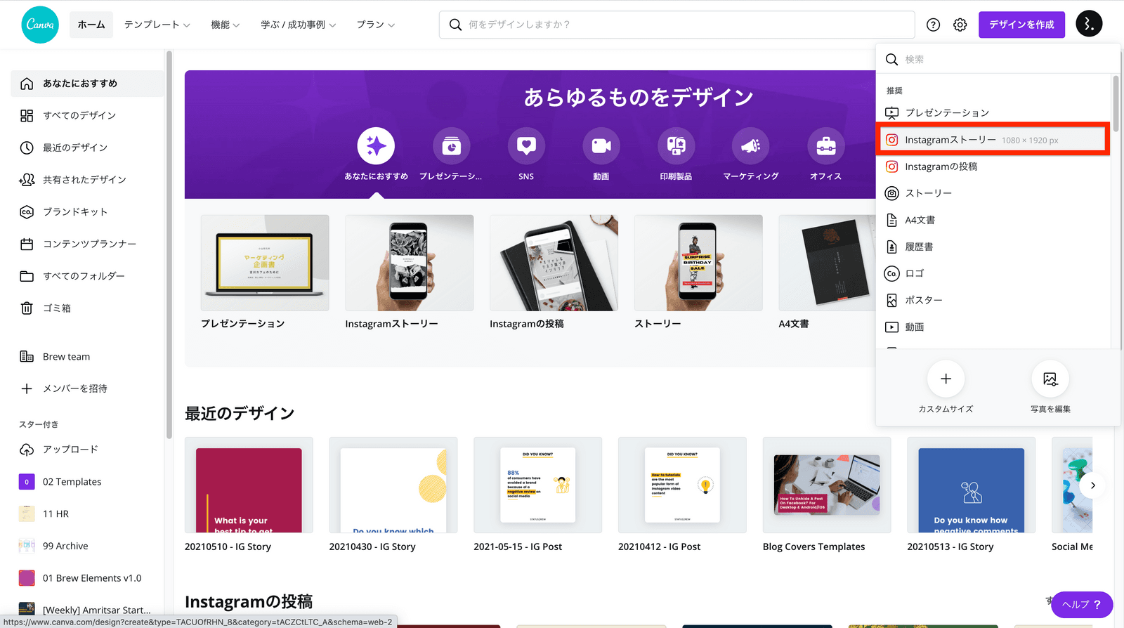 1.Canvaを開き、右上のデザインを作成からInstagramストーリーを選ぶ