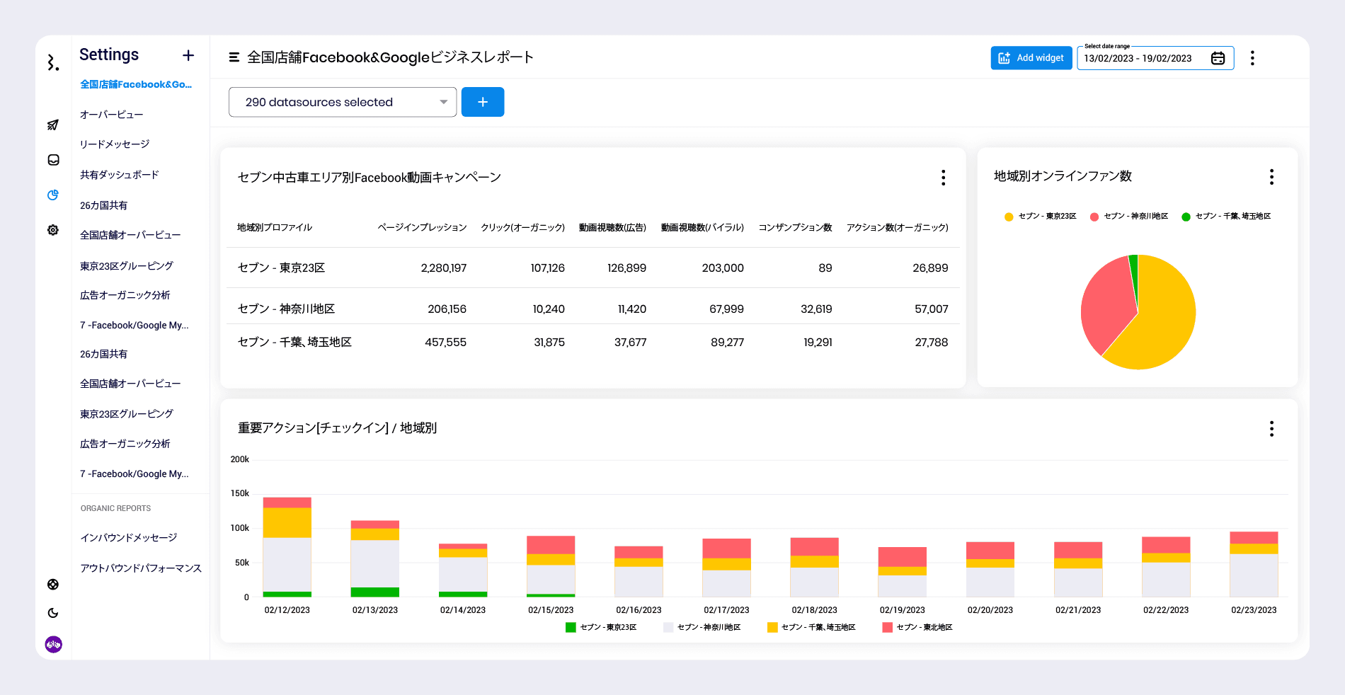 そして、すべてのソーシャルメディアマーケティングプラットフォームからデータをライブで取り込んだら、地域ごと、事業ごとにプロファイルを簡単にセグメント化して、さまざまなロケーション(例:単一、クラスター、地域、全国、国ごと)をズームイン/アウトすることができます。