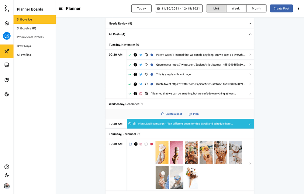 Statusbrewのソーシャルメディアのエディトリアルプランナーと呼ばれる予約一覧表では、ツイートの閲覧、編集、スケジュール変更、削除、ツイートの複製、リツイート、引用リツイートがすぐにできます。