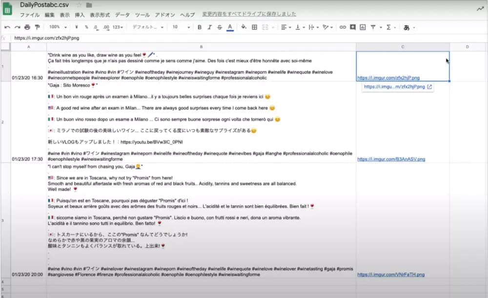 カテゴリー時間を選ぶ場合は、Aに日付時間を入力する必要はなく、そのままキャプションを入力し、画像URLはB列に挿入してください。これで準備は完了です!