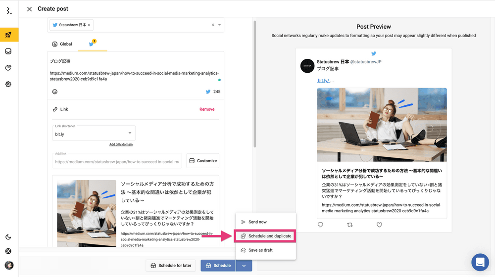 予約の際に、Schedule and duplicate(予約と複製)ボタンをクリックすると、このコンポーズのエディター画面にそのまま今表示されているコンテンツが表示され続けますので、繰り返しこのSchedule and Duplicateボタンをクリックし続けます。※予約時間のスロットをカテゴリーにすると便利なことをお忘れなく!