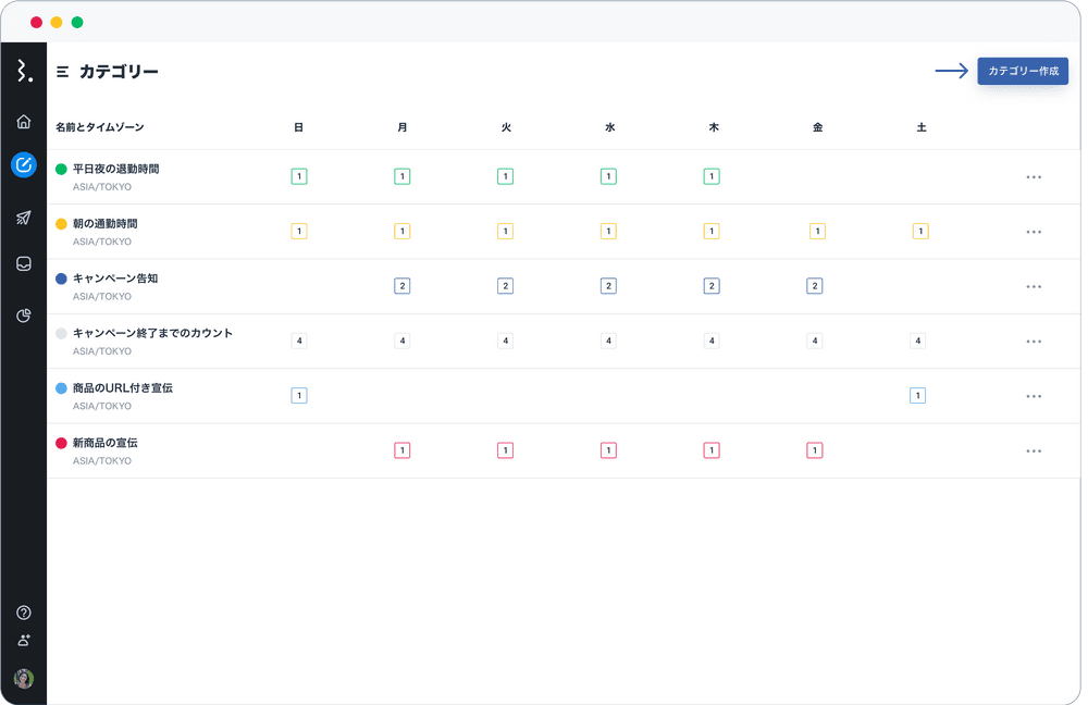 例:カテゴリーA> Twitter、求人募集、毎日朝の11時