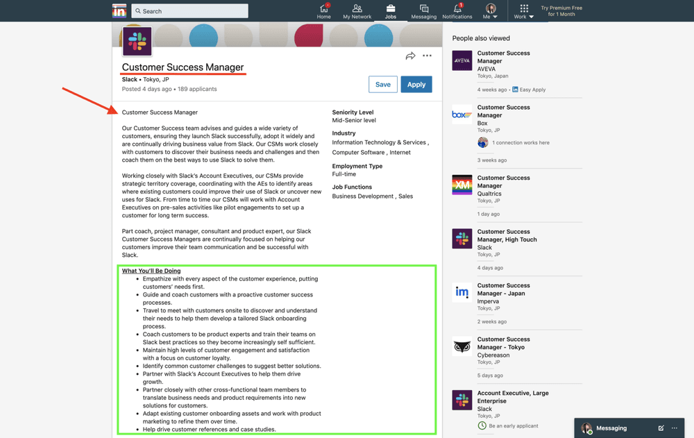 ご覧の通り、この職種に対して135,000件近くの求人がLinkedInで見つかりました。旅行予約/レビューサービスのTripadvisorも募集をかけていますね。では、実際におすすめの求人として出てきた企業の中で、皆さんもご存知であろうチャット式コミュニケーションツールSlackのCustomer Successの募集要項を読み、まずは学んでみましょう。Tipですが、LinkedInのこのような記載は役職や何を求められているのか、製品やサービスなのか、誰と関わらなければならないのか、業界のことを調べる時にも役に立つマーケティングツールの一つです。