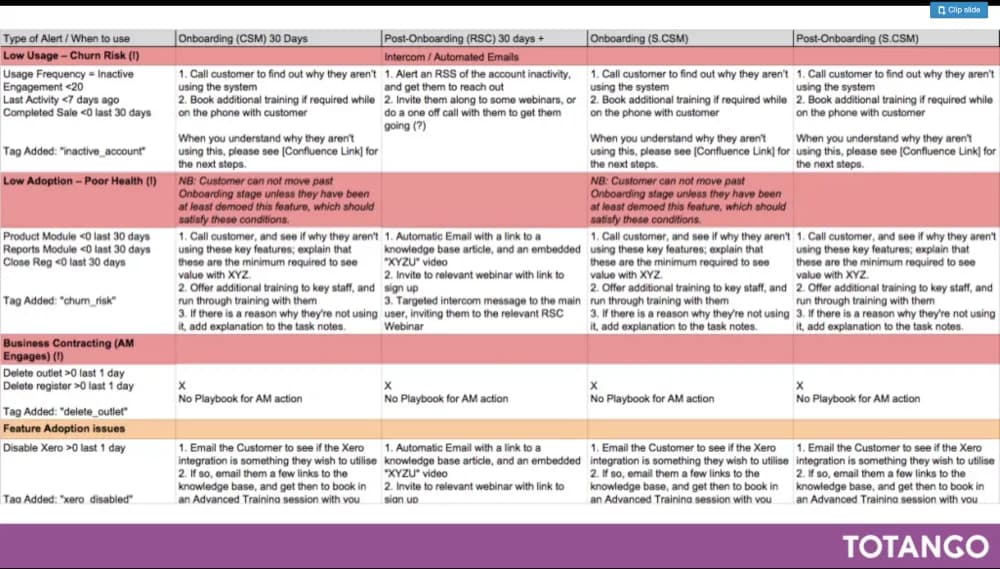以下はTOTANGOと言うカスタマーサクセス作業を便利にするプラットフォームが提供している具体的にどのようにカスタマーサクセスの仕事の中でどんな仕事が発生しているかを可視化するスライドです。タイムラインやビジネスのクオリティ、ユーザーのステイタス(カスタマーヘルス)に基づくカスタマーサクセスのアクションを明記しています。