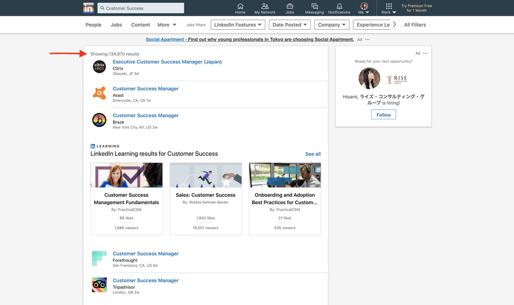カスタマーサクセスという職種の定義を説明する前に、最大級のビジネス特化型プラットフォームであるLinkedInで試しにCustomer Successという仕事で求人を検索してみましょう。