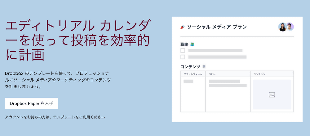 クラウドストレージとして名高いDropboxですが、なんとソーシャルメディア専用のエディトリアルカレンダーもあります。その名もDropbox Paperです。