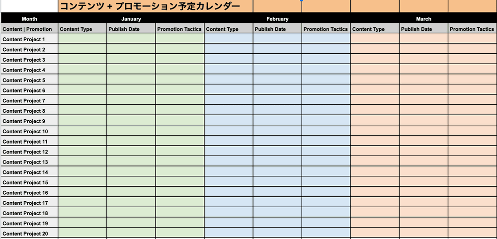 定義:あらかじめソーシャルメディア用の投稿を計画しておくために使用されるGoogleスプレッドシートやアプリケーション上のコンテンツ計画カレンダーです。いつどのコンテンツを投稿するか社内で共有しながら計画したり、キャンペーンを管理したり、期限を設けるためにも使用されます。