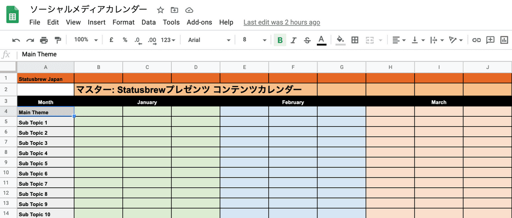 まずはメインテーマの行を使用して、各月の主要なコンテンツテーマをマップします。 次に、メインテーマをサポートする、具体的に投稿するコンテンツのサブトピックを入力します。