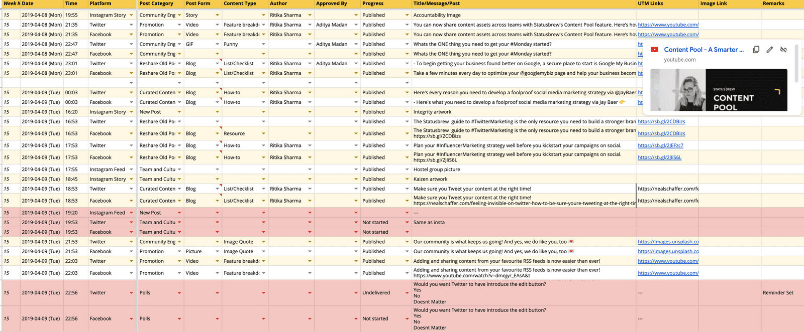 こちらも先ほどの目標設定シートに続き、Statusbrewが実際に使っているエディトリアルカレンダーです。 ・承認プロセス(最終的にPublishedになっているように指示) ・投稿のタイプや投稿時間 を細かく指示されています。