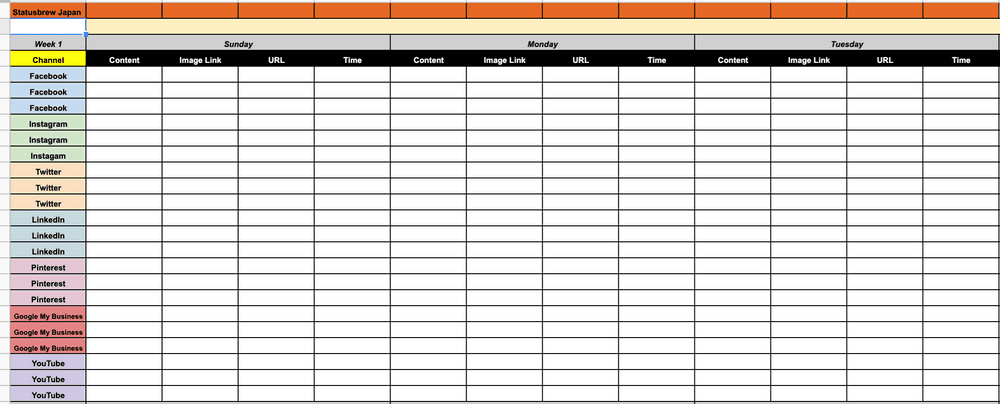 Content: ソーシャルメディアのコピー(文章) Image Link:画像や動画も投稿に含まれる場合はクラウドストレージサービス(GoogleドライブやDropboxなど)にアップロードします。 次に、ここに画像へのリンクをドロップします。 これにより、投稿を作成する準備ができたときに画像に簡単にアクセスできます。 URL:ブログ記事など投稿にリンクが含まれる場合は、ここにドロップしてください。 次に、実際に投稿する日付を割り当てることができます。これは通常、共有するコンテンツの作成が完了した直後に行われますが、Statusbrewなどのツールを使用してスケジュールを前倒しで計画することができます。