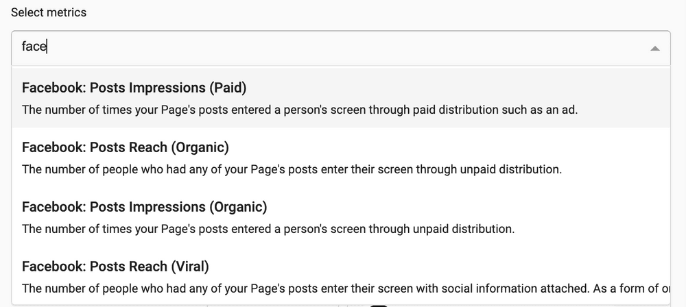 これはFacebookだけではなく、例えばFacebookとその他のリソース(複数のFacebookページがある場合、複数のソーシャルネットワークがある場合)を横刺しで比較したいときにデータをすべて取得するためのメトリクスです。