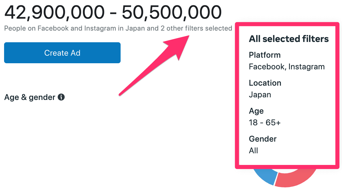 このセクションの推定オーディエンス規模と各セグメントを表示します。推定オーディエンスサイズの範囲の下には、このアナリティクスに適用されたフィルタの説明が表示されますが、最初に表示されるフィルターは、デフォルトのプラットフォーム(FacebookとInstagram)と地域がセットされていますの。