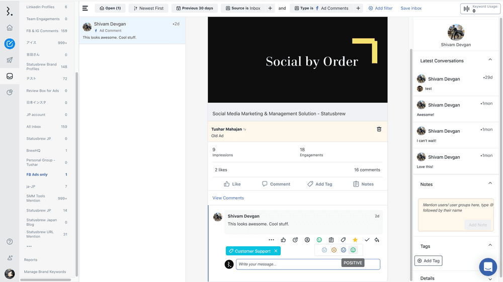 Statusbrewは、すべてのソーシャルメディアエンゲージメント管理のためのセンチメント分析を提供しています。Statusbrewは、人間関係や言語に関して高度に訓練されたAIにより、各ソーシャルメディアのDMやコメントなど全てのエンゲージメントをポジティブ、ネガティブ、またはニュートラル、混合に瞬時にマークします。また、12の言語をサポートしています。