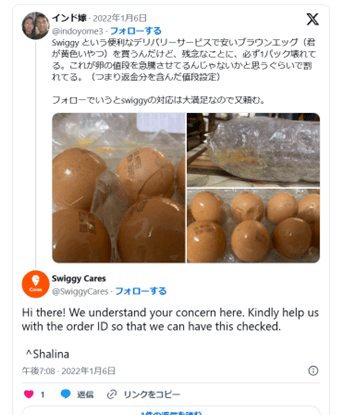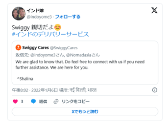 例えばこちらはインド発のフードデリバリーサービス Swiggyですが、Swiggyというキーワードでソーシャルリスニングをしているのでしょう。