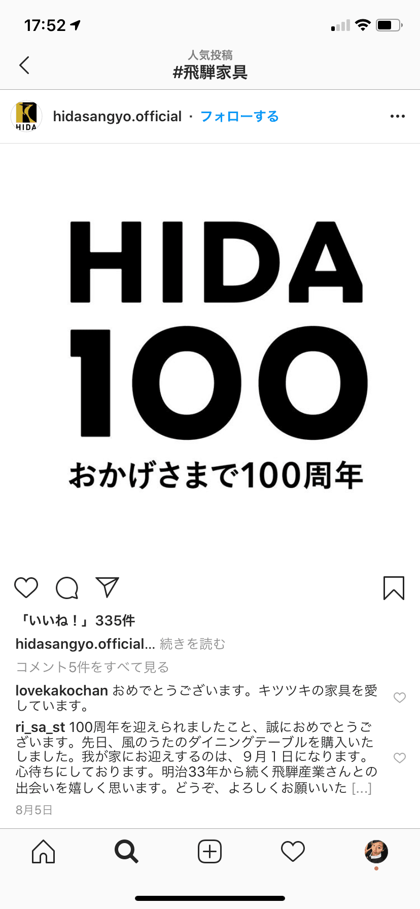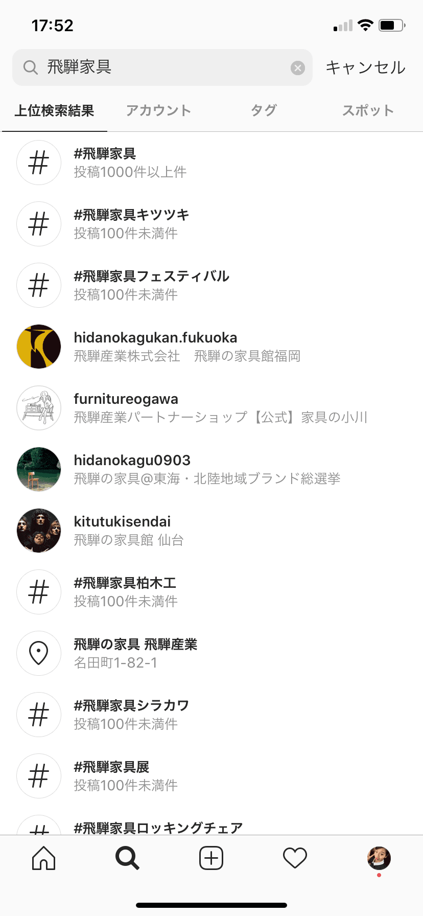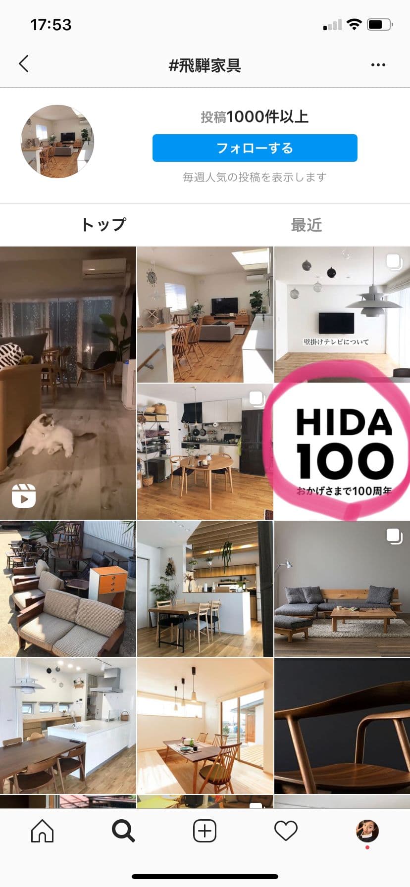 ハッシュタグからたどり着くとは、主にこのハッシュタグ検索バーで検索をかけた時から発生します。 Instagramの探索ページ(Explore)で何かキーワードを検索します。#飛騨家具としましょう。そうすると候補が結果ページにたくさん表示されますよね。この中で私がパッと目が止まったコンテンツをタップします。 一番右側のコンテンツにたどり着いた時点で、この有名家具企業の飛騨産業さんのInstagramプラットフォームに私が流れてきた、という事実になります。これがハッシュタグリーチです。