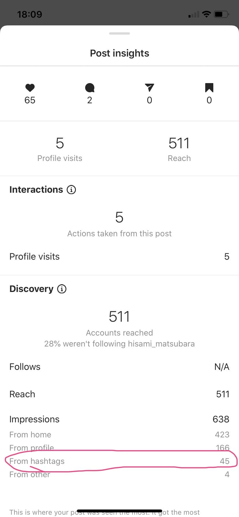 前提の情報として、 Instagramのフォロワーは900人 一つの投稿あたりのいいね!は115件。エンゲージメント率は13,34%とかなり良い方。 また、フォロワーからのリーチも悪くはない、毎日約400〜450人がそのユーザーさんの投稿を閲覧しています。 しかし、ハッシュタグによるリーチ範囲は非常に低く、10〜15人程度だそうです。