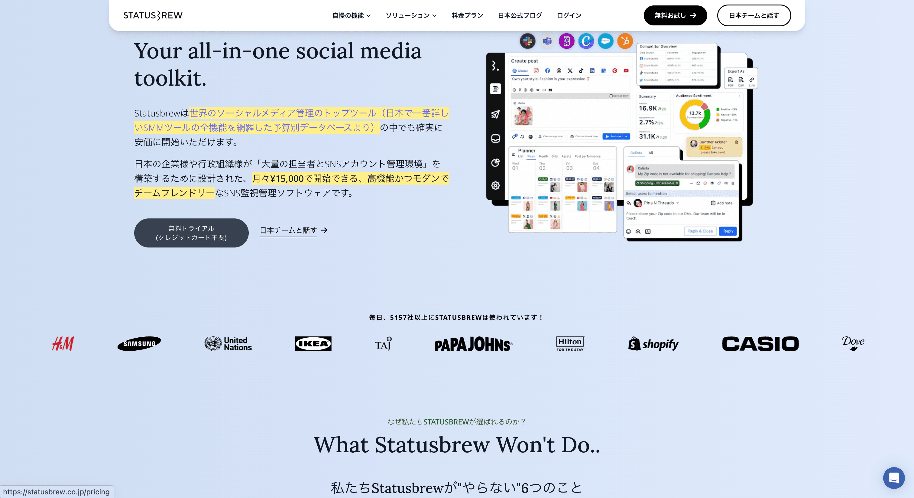 あなたのチームメンバーが例えば5人の場合、すでに1500ドル、つまり月額20万円以上もの料金になります。いやいやそんなお金はいきなり投資できない場合、Sprout SocialとHootsuiteの全機能を網羅していて、かつ価格もぐんと抑えたい場合、「良いところどりをしたい」「+で日本語に対応したツールが欲しい」場合、Statusbrewをお試しください。