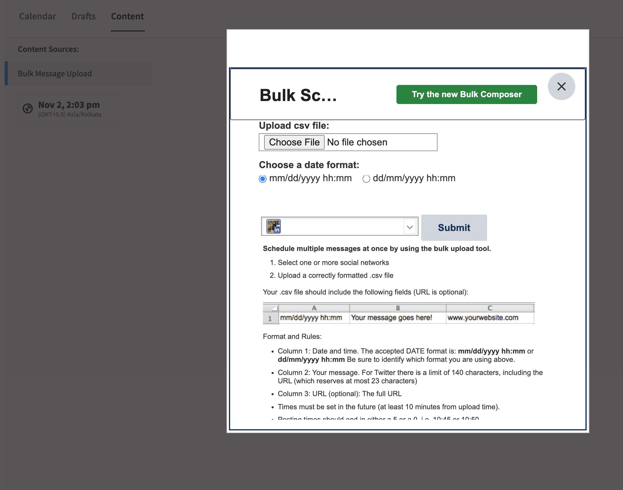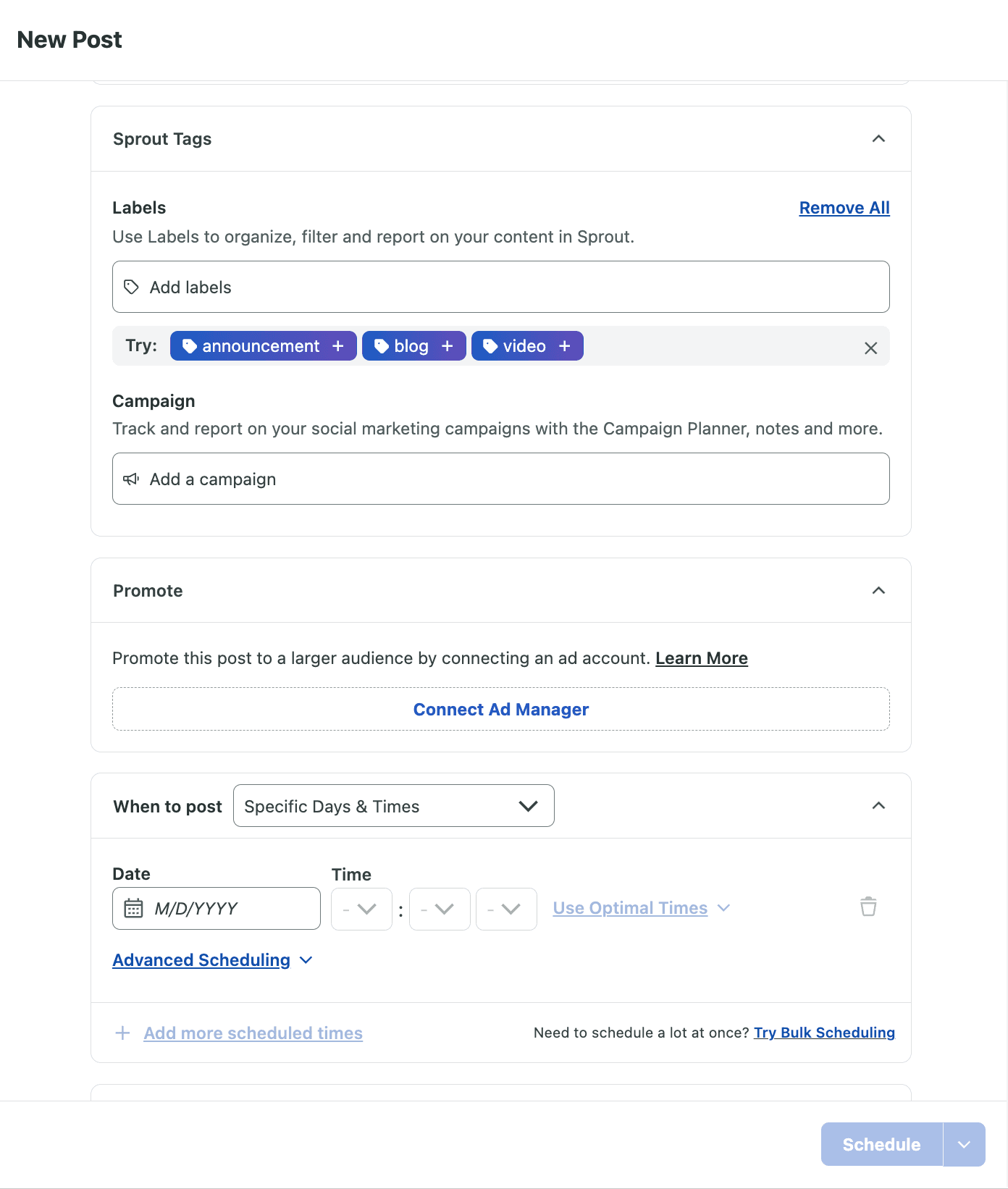対照的に、Sprout Socialでは、投稿作成画面から投稿をスケジュールする際にのみ、最適な投稿時間の推奨が表示されます。